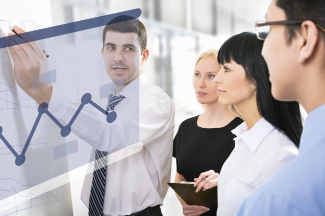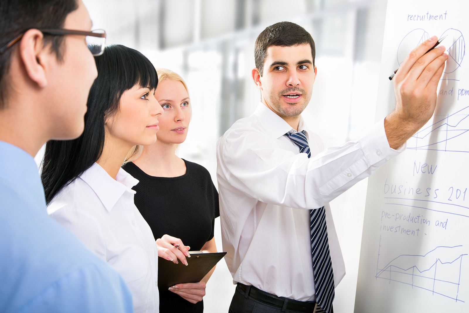 „Business man makes a presentation in the office standing behind the easel for the business team“ © pantovich – Adobe Stock