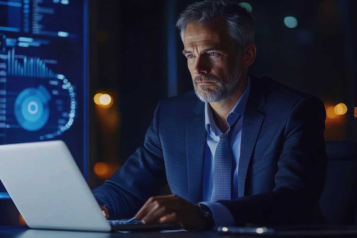 „A man in formal attire works intently on his laptop while surrounded by glowing digital screens” © Olexandr Tytarchuk – Adobe Stock